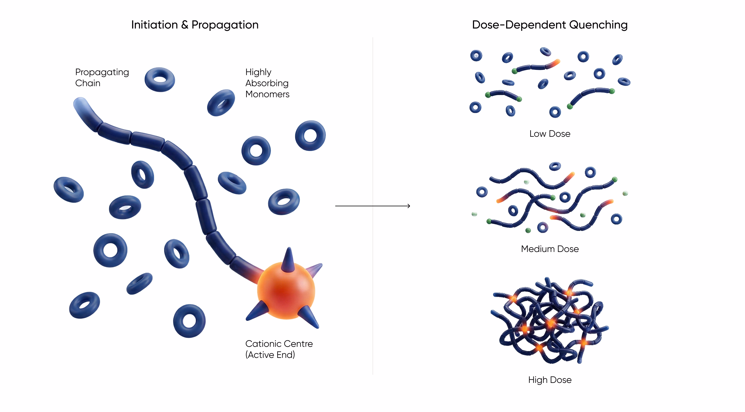 The resist formulation contains multiple functional elements that respond differently depending on local initiator concentration. In regions with low initiator levels, reactions are suppressed, preventing isolated activation events from forming features.